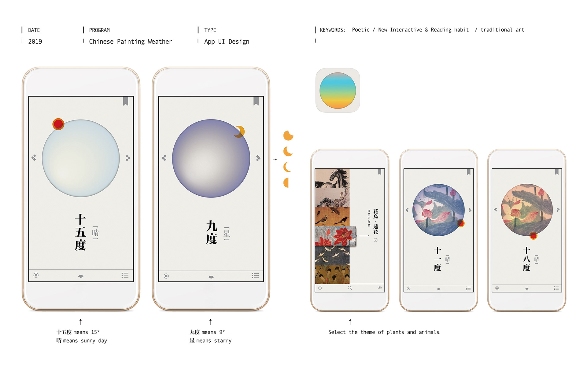 The app will analyze the current season and climate to decided which subjects of Chinese painting would be used as the background-image. On the other hand,users can choose which subjects of work they like too. The color of the sky has a interesting interaction with the painting and with the subject of painting. I hope that this app can let more people worry about the nowaday environmental pollution. In addition, may be it can attract some Chinese young people to know more about the Traditional Chinese Art. Since there are too many young people who know nothing about their own country's culture. Image-1: This app use the Chinese landscape painting to show the climates and temperatures, which is the fundamental understanding of Chinese landscape painting, therefor it can intuitive show the time since the color of the sky has the function of the time reference. This circle has the function of the dial, rotate the sun button or the moon button can directly selected point in time thus ch