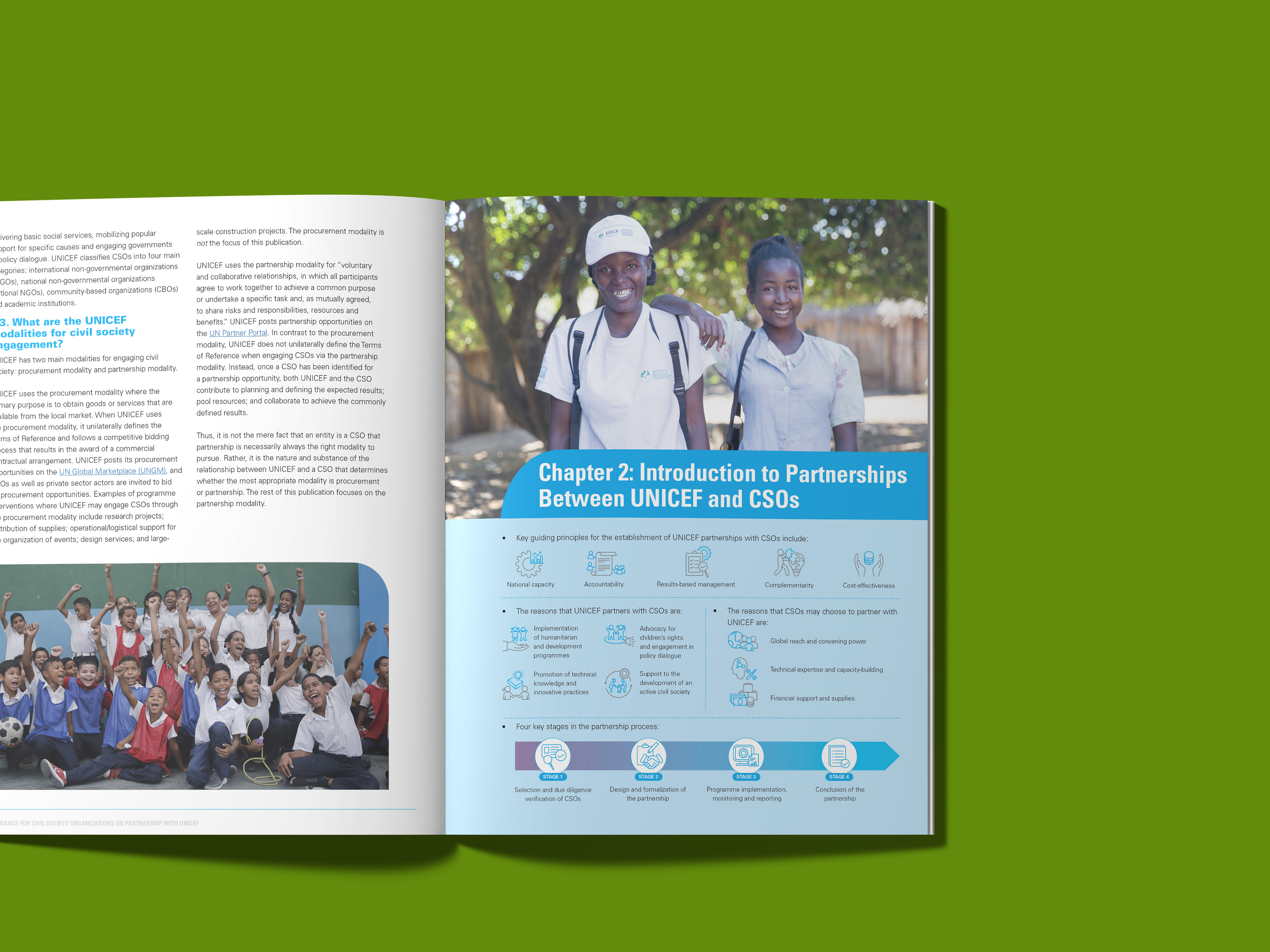 The purpose of this publication is to promote common understanding of UNICEF’s civil society partnership requirements. It is hoped that by reducing the information asymmetry between UNICEF offices and CSOs, the publication will support the timely establishment of high-quality, results-focused partnerships that in turn deliver high-quality, results-focused development and humanitarian programmes. The primary audience of this publication is both current and prospective civil society partners. The content of the publication may be especially relevant to those CSO personnel who are focal points for developing or managing partnerships with UNICEF. This publication, which focuses on the general operationalization of civil society partnerships with UNICEF, is to be read in conjunction with other publications that provide technical guidance on collaboration in specific programme sectors.
