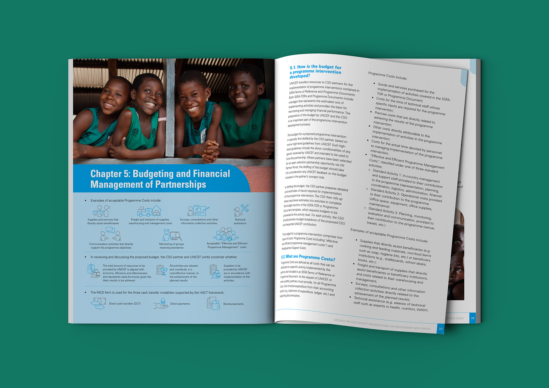 The content of this publication is aligned to the requirements of UNICEF’s 2019 CSO Procedure. As and when UNICEF’s internal procedure is revised, this publication will be revised accordingly. The publication may also be periodically revised to reflect user feedback and provide greater clarification. Please send feedback, suggestions or queries on the content of this publication to csopartnership@unicef.org. For all other partnership-related inquiries, the UNICEF field office should serve as the first and primary point of contact.