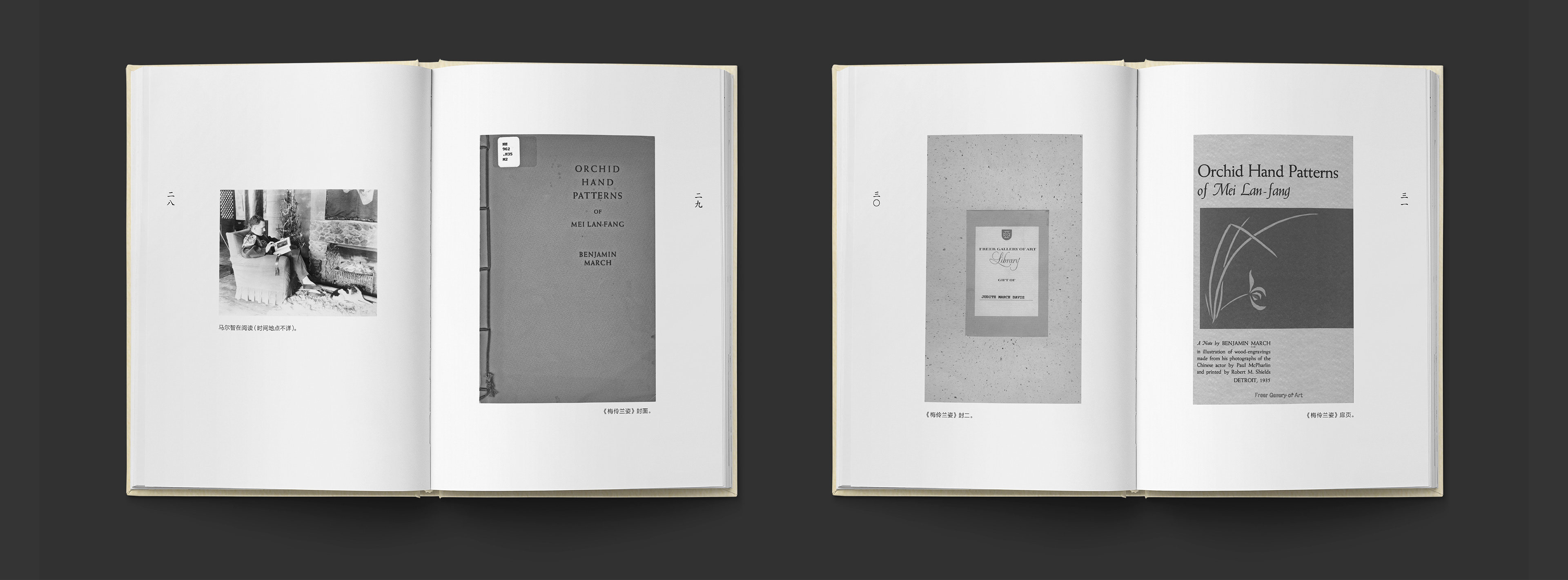 Benjamin March (1899—1934) was an art writer, curator and lecturer from the US. He was deeply impressed by Mei Lanfang’s art and especially admires the beauty of his orchid hand patterns in Peking Opera performance. In 1931, March paid a visit to the Mei’s family in China and photographed Mei’s hand patterns, his garden and friends. In 1934, March published the book <Orchid Hand Patterns of Mei Lan-fang>. The book included March’s essay on Mei Lanfang’s art and 10 pieces of wood-engraving illustrations of orchid hand patterns from his photographs created by Paul McPharlin.